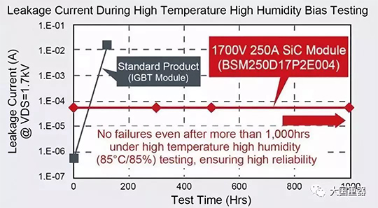 新型BSM250D17P2E004產(chǎn)品引入了一種新的封裝方法和涂層材料,以保護芯片免受介電擊穿,并抑制漏電流的增加,使模塊能夠通過HV-H3TRB可靠性測試。例如,在這種高壓、高溫、高濕度反向偏壓測試期間,當在85°C和85%濕度下施加1360V超過1000小時時,器件沒有出現(xiàn)故障,不同于傳統(tǒng)IGBT模塊,通常在1000小時以內(nèi)因電介質(zhì)擊穿而導致失效。為確保最高水平的可靠性,ROHM以不同的間隔測試了模塊的漏電流,最高阻斷電壓為1700V。